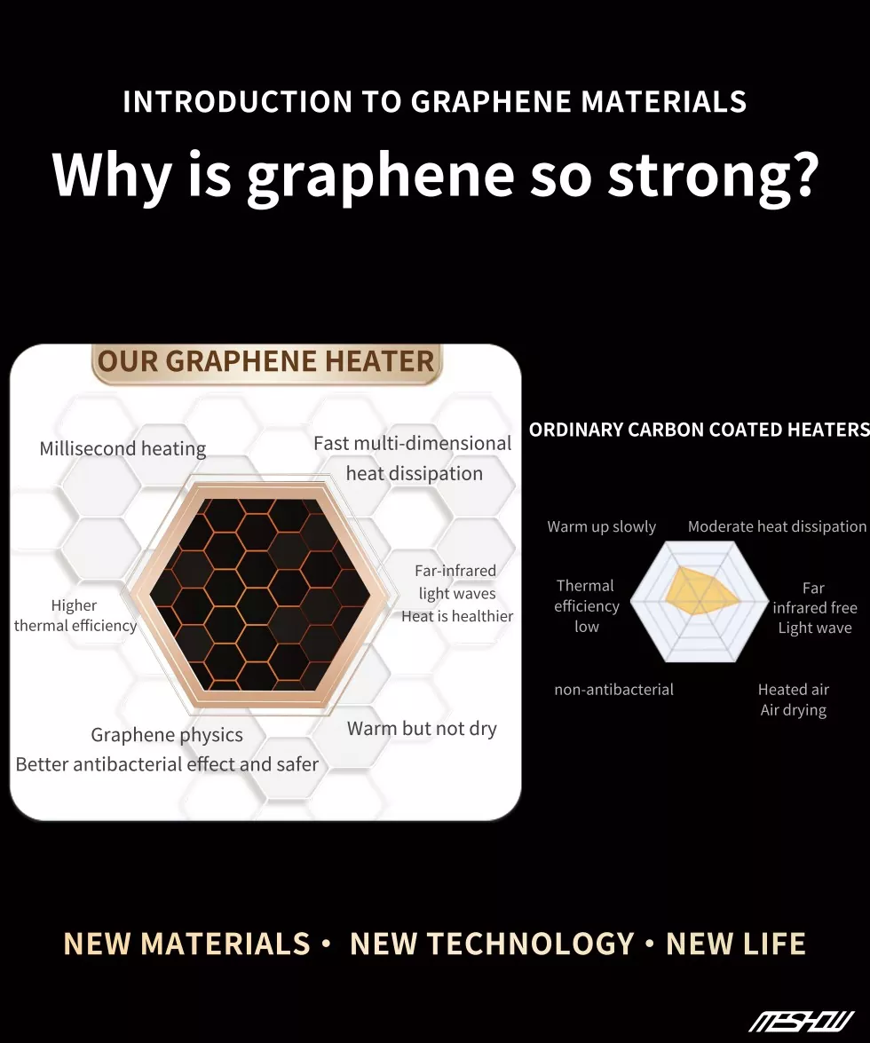 „2200W White Graphene“ burnoje elektrinis šildytuvas pasižymi unikaliu tolimojo infraraudonųjų spindulių šildymo metodu, pagrįstu grafenu, kuris yra arčiau paties kūno radiacijos šilumos išsklaidymo režimo. Jis prasiskverbia į odą ir jį absorbuoja kūnas, skatina kraujotaką ir suteikia patogią bei sveiką šildymo patirtį iš vidaus.