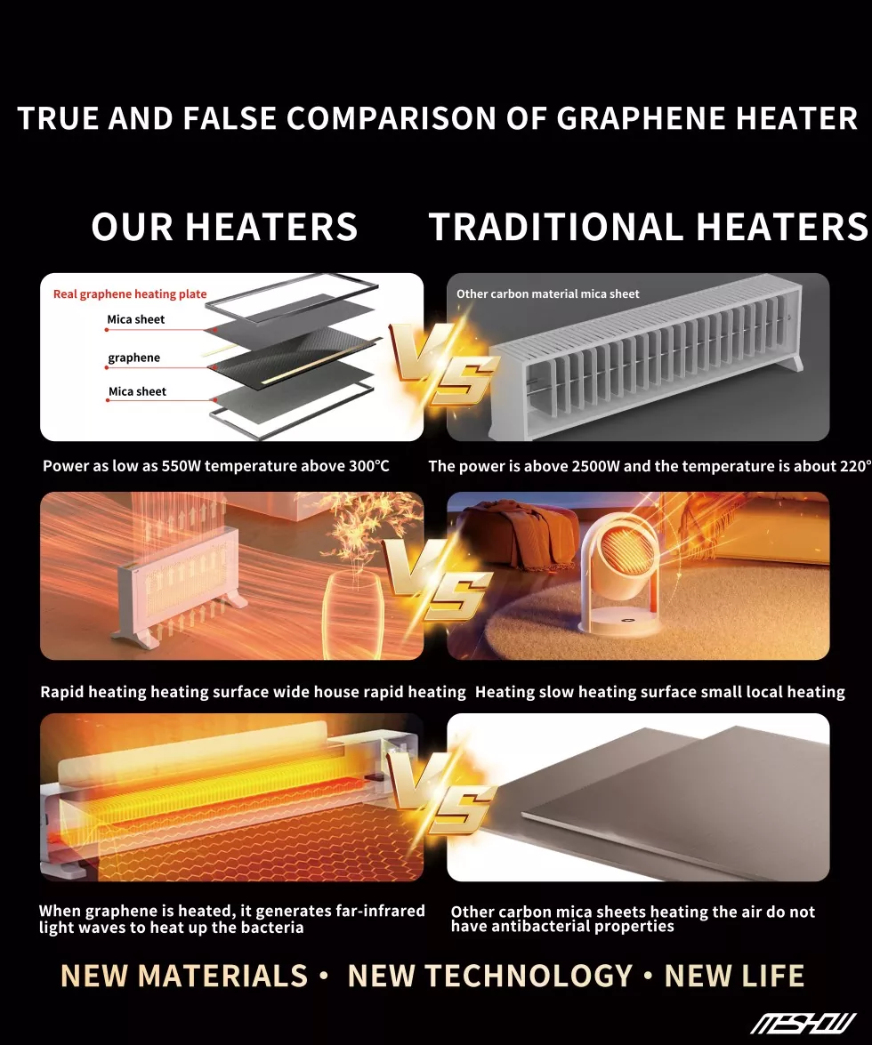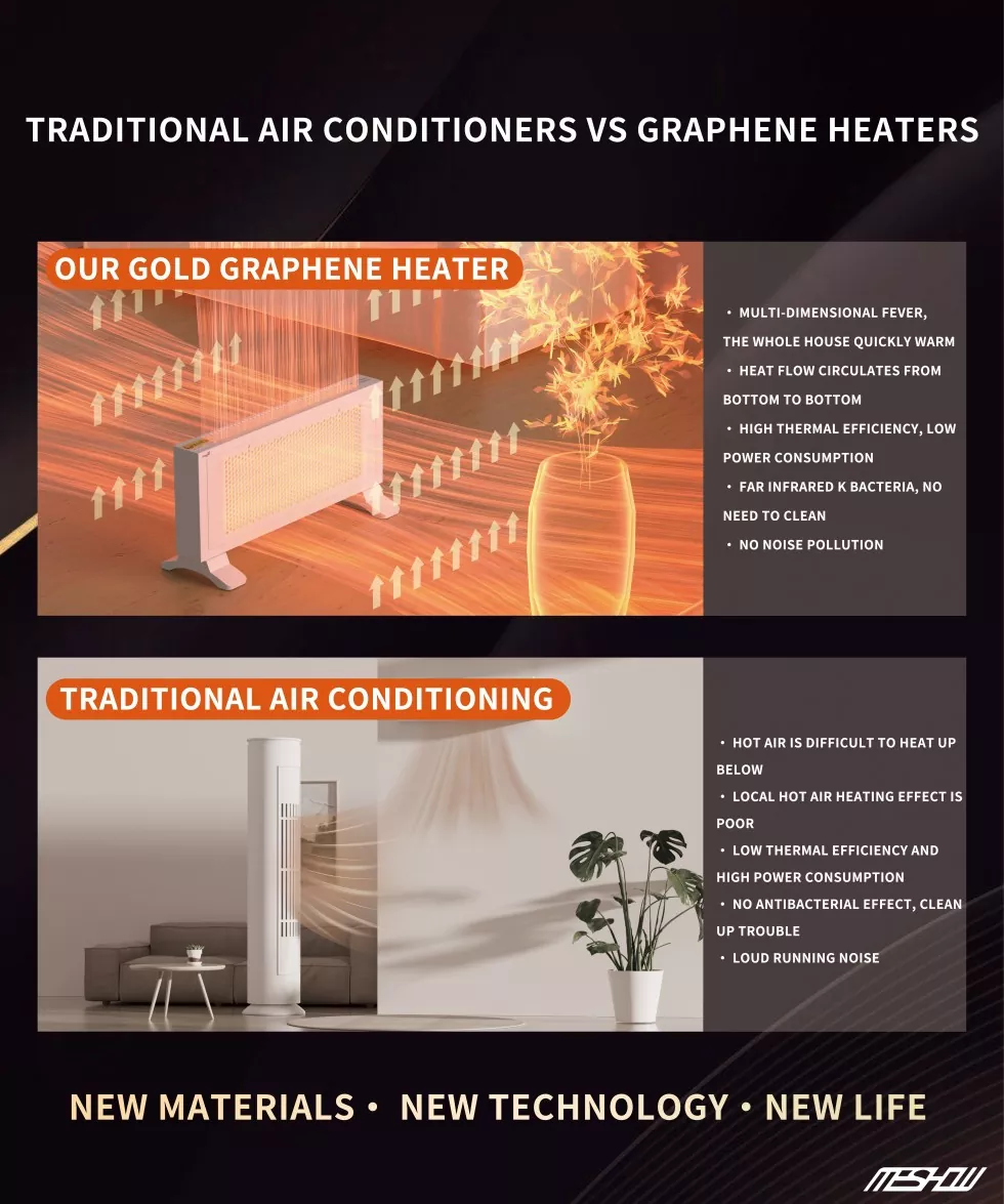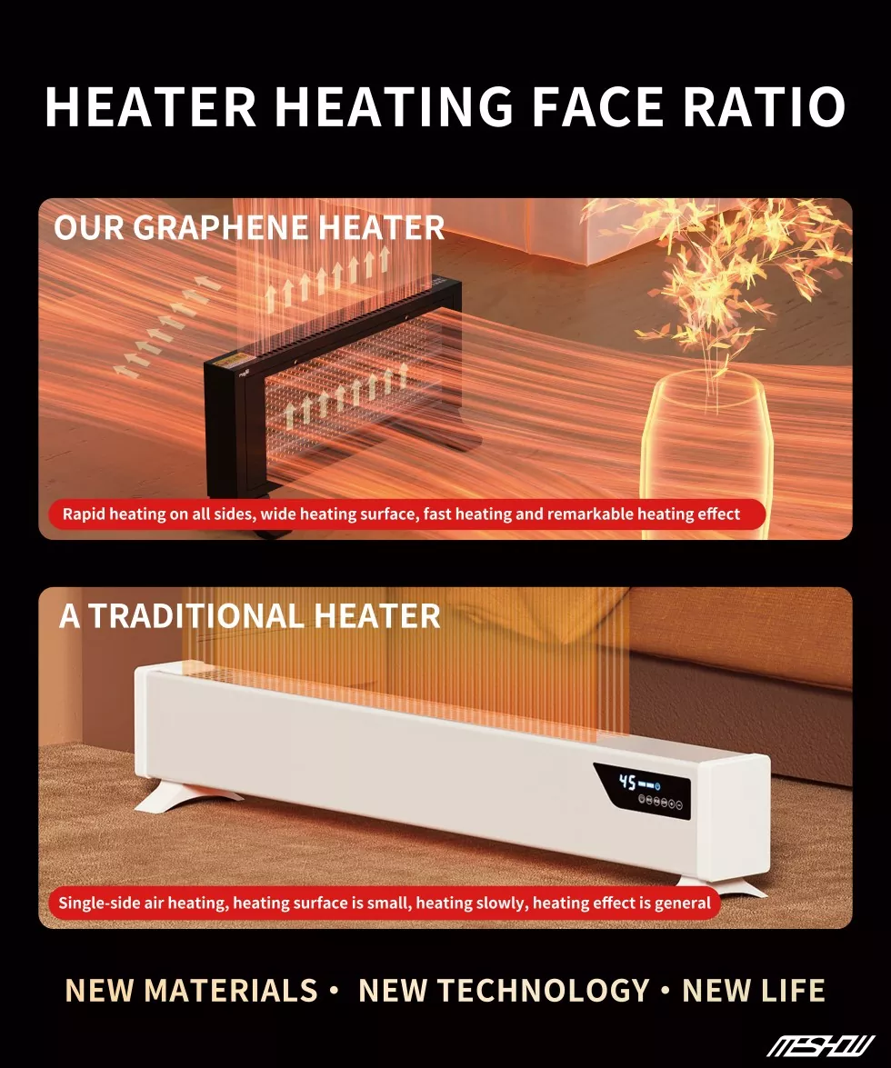 Nedidėdamas pastangų, „MeShow“ sukūrė aukštos kokybės 2200W baltojo grafeno grindjuostės elektrinį šildytuvą, kuriame yra paprastas ir elegantiškas išorinis dizainas, kuris ne tik atrodo gerai, bet ir taupo vietą. Šis šildytuvas įgauna grafeno šilumos laidumą, todėl jis greičiau nepūto vėjo ir sumažina vandens išgarinimą. Jis ilgą laiką yra praktiškas ir neišdžiūs, todėl tai bus patogiau, nei įjungti oro kondicionierių. Kita vertus, tai taip pat taupo elektrą.