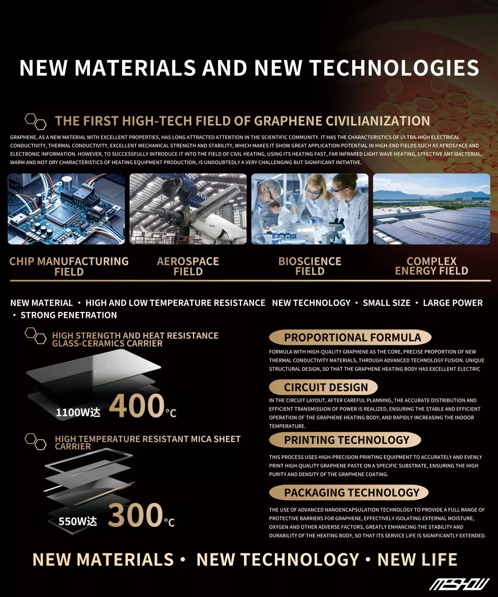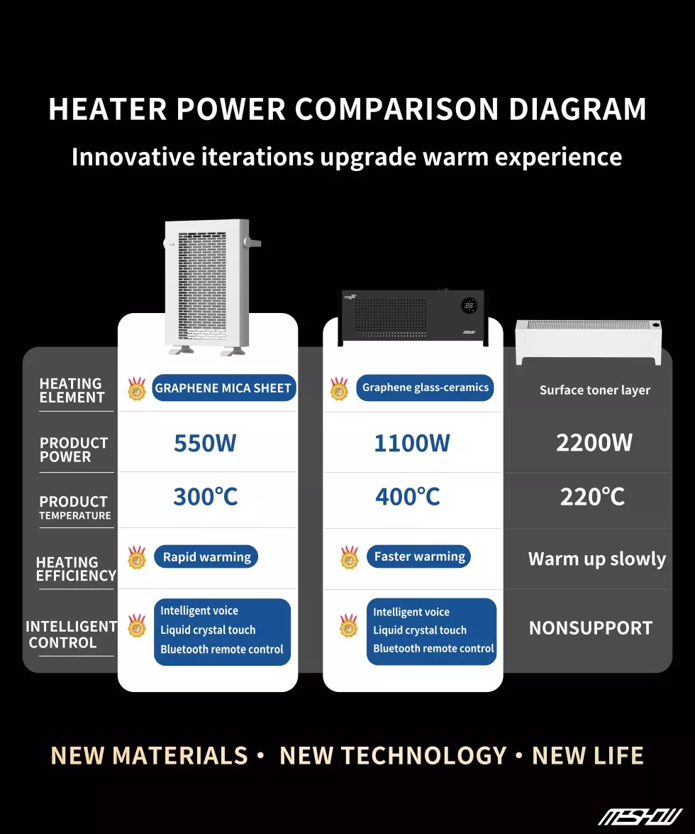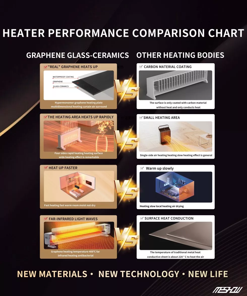 „MeShow“ yra įmonė, teikianti didmenines ir pritaikymo paslaugas. Jis išleido savo pagrindinį produktą „2200W White Graphenene Basedoard“ elektrinį šildytuvą, kuris yra dviejų tipų: O formos ir X formos. Jis ir toliau naudoja juodą konstrukcinę technologiją, su lygiu ir baltu paviršiumi, patogiu prisilietimu ir grynu bei nepriekaištingu korpusu. Jis yra grynas ir elegantiškas, todėl gali lengvai integruoti į įvairius namų stilius.
