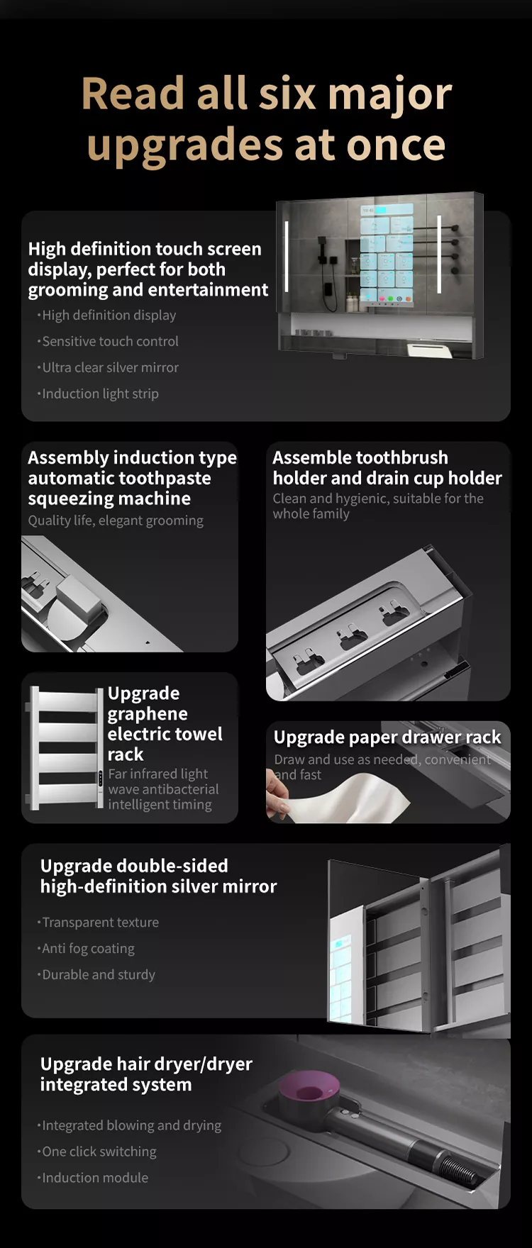 Kaip grafeno gyvenimo pradininkas, „MeShow“ palaiko „naujų medžiagų, naujų technologijų ir naujo gyvenimo“ koncepciją. Ši grafeno intelektualiojo vonios veidrodžio spintelė pritaikyta. Produktas naudoja lydinio fiuzeliažą, daugiasluoksnį purškimą, fiuzeliažą yra patvari ir atspari rūdijimams. Veidrodinio spintelės veidrodyje yra veidrodinis jutiklinis ekranas ir išmanioji lustas. Tai gali baigti daugiafunkcinę valdymą ir garso ir vaizdo pramogas ekrane. „Support Custom Download“ programa. Produktas turi turtingas funkcijas. Visi modeliai yra su standartine LED šviesos juostele, automatine dantų pastos spaustuko mašina, dantų puodelio nusausinimo stovas, dantų puodelio dantų šepetėlis Ultravioletiniame dezinfekavimo įtaise ir skustuvų dezinfekavimo įrenginyje. Įrengtas popieriaus stalčius, dvigubos paskirties pūstuvų/džiovintuvo konvertavimo prietaisas, veidrodinis aukšto definition ekrano ekranas, veidrodžio deformavimo sistema, integruota Controlcontrol, integruota „ControlControl“, „Veidrodinis aukšto definicijos ekranas“, „Miror Control ControlControl“, „Veidrodinis“ aukšto definition Ekrano ekranas, veidrodinė veidrodinė sistema, integruota integruota ControlControl, „Veidrodinis aukšto definicijos“ ekranas. Grafeno šildymo ir džiovinimo rankšluosčių lentynos, indukcinės rankos dezinfekavimo priemonės, intelektualios kvepalų ir oro valymo sistema.