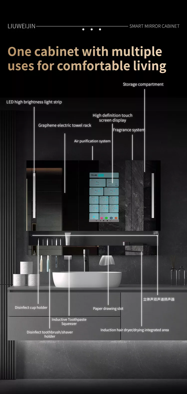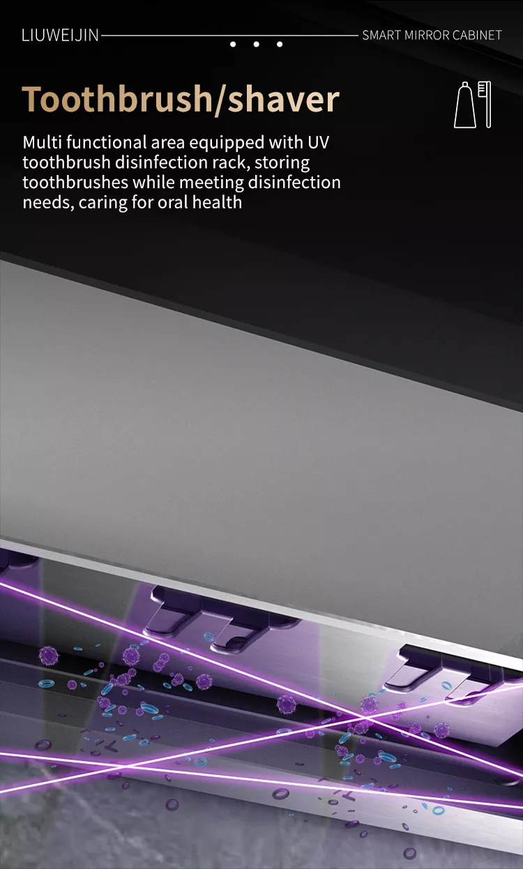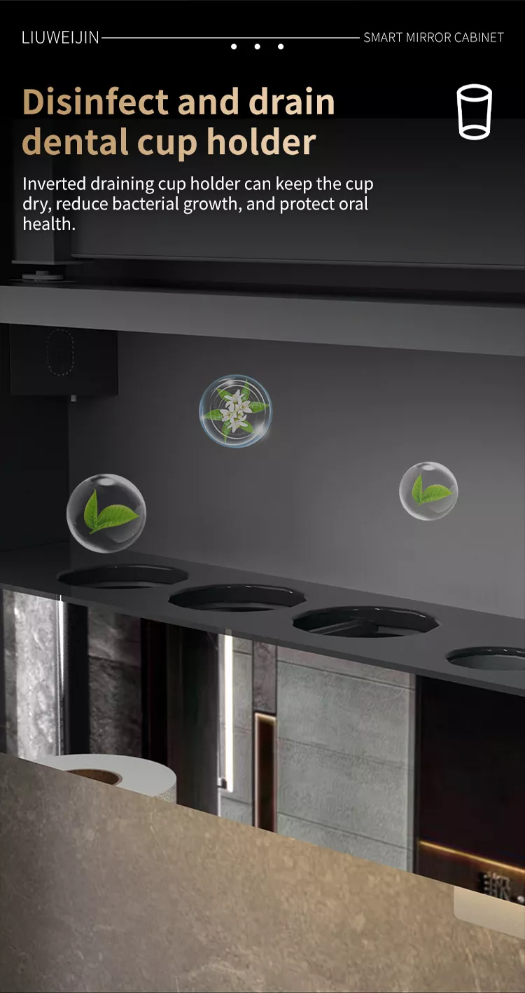 Integruotas rankšluosčių stovas priima grafeno šildymo elementą, kuris ne tik gali greitai išdžiovinti rankšluostį, o pačios grafeno tolimosios infraraudonųjų spindulių bangos, kuri naudinga žmogaus kūnui, gali sterilizuoti ir deodorizuoti rankšluosčius Standartinė automatinė dantų pastos išspaudimo mašina ir dantų šepetėlio puodelis Ultravioletinis dezinfekavimo įtaisas daro skalbimą paprastą, saugų ir raminantį bei apsaugotų visos šeimos sveikatą. Jei jūs vis dar nerimaujate dėl drėgno kvapo vonios kambaryje, šis produktas turi įmontuotą oro valymo sistemą ir kvapą.