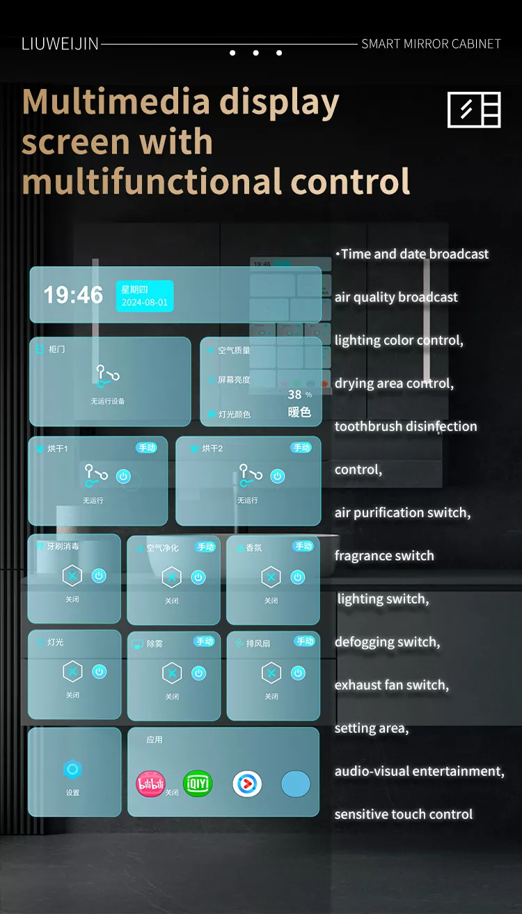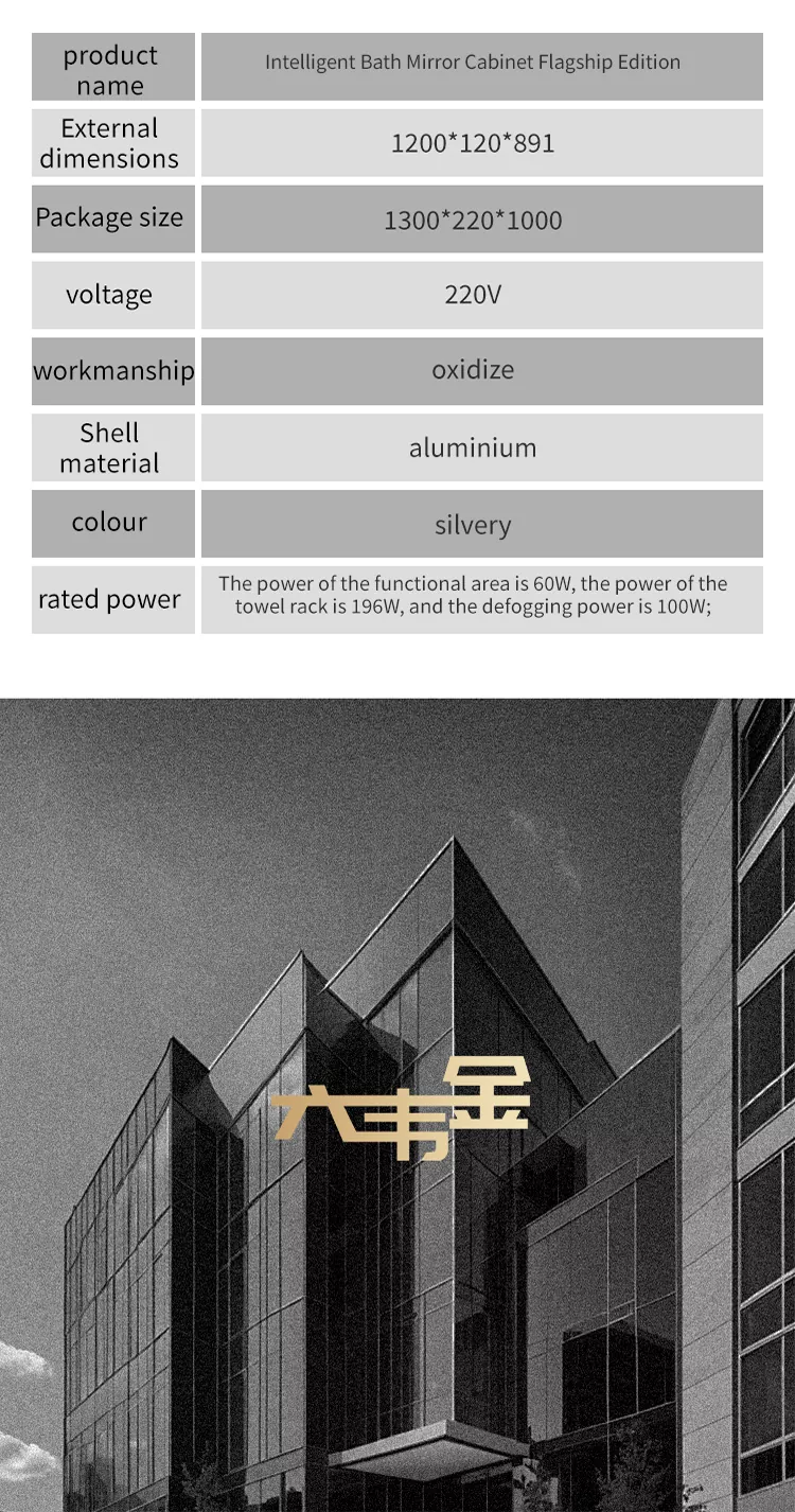Ši liuwei jinshi grafeno išmaniosios vonios veidrodžio spintelė yra pagaminta iš lydinio medžiagos, kuri yra patvari ir drėgmei atspari. Standartinė LED šviesos juostelė, automatinė dantų pastos išspaudimo mašina, dantų taurės nutekėjimo lentynos, dantų puodelio dantų šepetėlio ultravioletinis dezinfekavimo įrenginys, skutimosi dezinfekcijos prietaisas, ekrano ekranas, dvidešimties dantų virvelių vir pervandeninis įrenginys. Indukcinės rankos sanitarijos, veidrodžio ištepimo sistema, „Cheng“ tipo valdymo centras. Prabangiame modelyje yra grafeno šildymo ir džiovinimo rankšluosčių lentynos, intelektualios kvepalų ir oro valymo sistemos.
